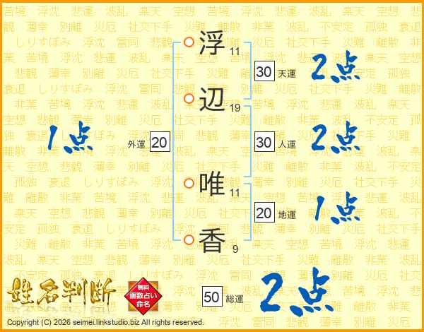 浮(11画)辺(19画) 唯(11画)香(9画)