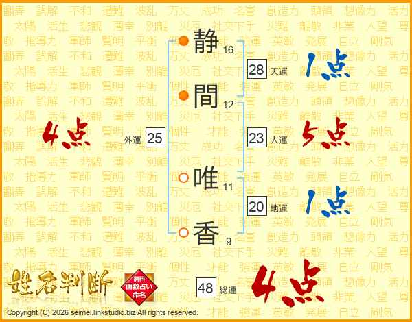静(16画)間(12画) 唯(11画)香(9画)