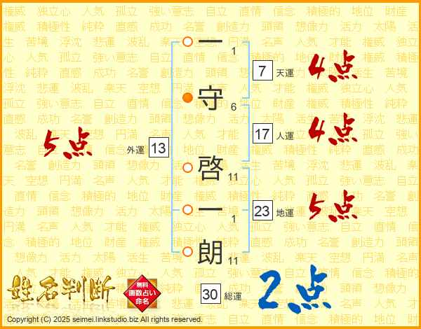 一(1画)守(6画) 啓(11画)一(1画)朗(11画)