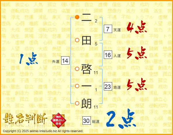 二(2画)田(5画) 啓(11画)一(1画)朗(11画)