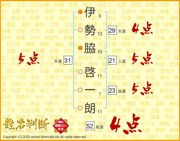 伊勢脇啓一朗さんの総運は52画の4点!