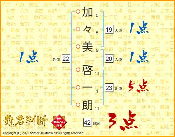 加(5画)々(5画)美(9画) 啓(11画)一(1画)朗(11画)