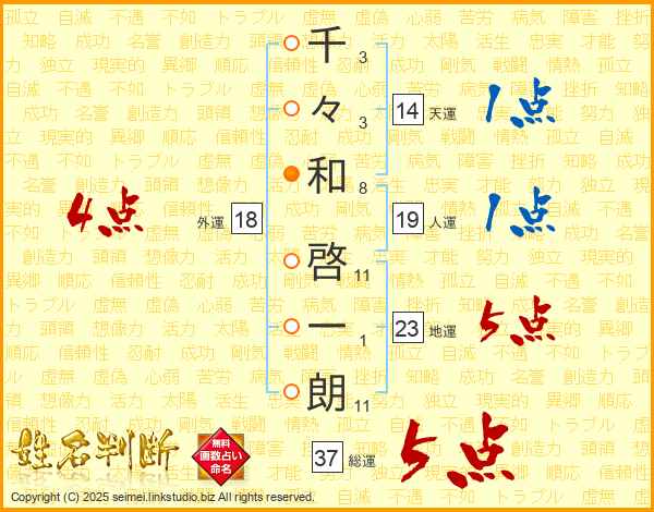 千(3画)々(3画)和(8画) 啓(11画)一(1画)朗(11画)