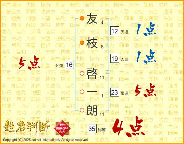 友(4画)枝(8画) 啓(11画)一(1画)朗(11画)