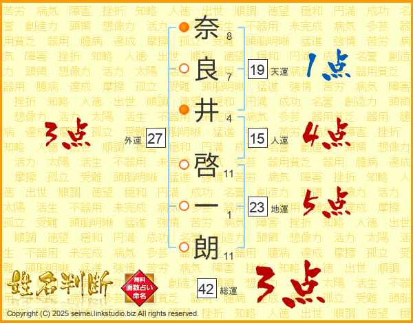 奈(8画)良(7画)井(4画) 啓(11画)一(1画)朗(11画)