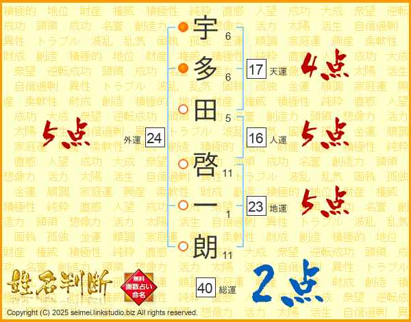 宇(6画)多(6画)田(5画) 啓(11画)一(1画)朗(11画)