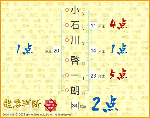 小(3画)石(5画)川(3画) 啓(11画)一(1画)朗(11画)