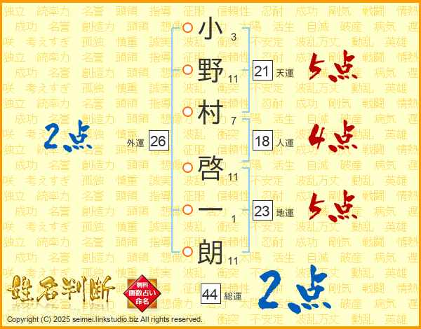 小(3画)野(11画)村(7画) 啓(11画)一(1画)朗(11画)