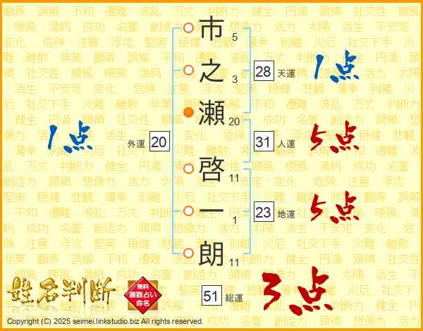 市(5画)之(3画)瀬(20画) 啓(11画)一(1画)朗(11画)