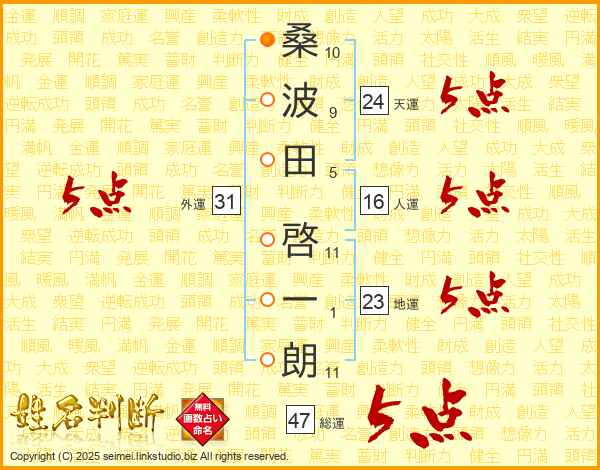 桑(10画)波(9画)田(5画) 啓(11画)一(1画)朗(11画)