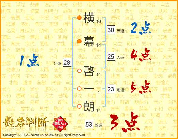 横(16画)幕(14画) 啓(11画)一(1画)朗(11画)