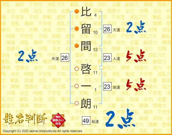 比(4画)留(10画)間(12画) 啓(11画)一(1画)朗(11画)