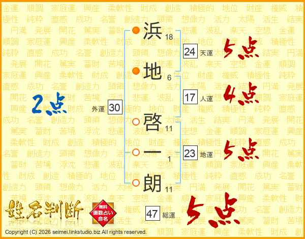 浜(18画)地(6画) 啓(11画)一(1画)朗(11画)