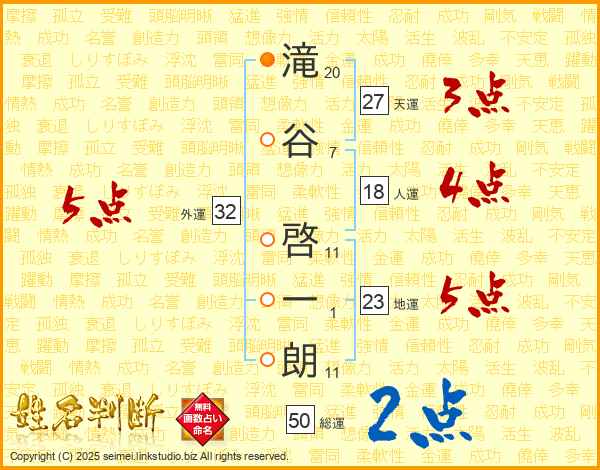 滝(20画)谷(7画) 啓(11画)一(1画)朗(11画)