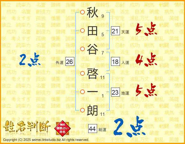 秋田谷啓一朗さんの総運は44画の2点!