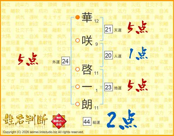華(12画)咲(9画) 啓(11画)一(1画)朗(11画)