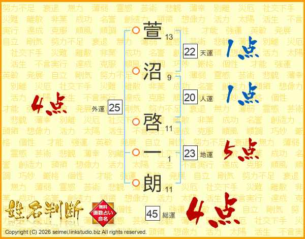 萱(13画)沼(9画) 啓(11画)一(1画)朗(11画)