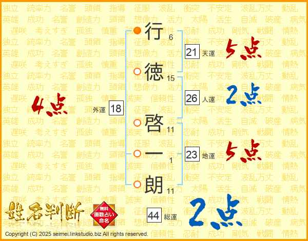 行(6画)徳(15画) 啓(11画)一(1画)朗(11画)