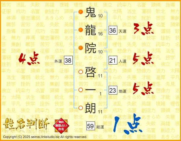 鬼(10画)龍(16画)院(10画) 啓(11画)一(1画)朗(11画)