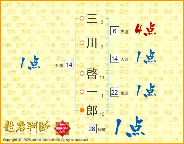 三川啓一郎さんの人運は14画の1点!