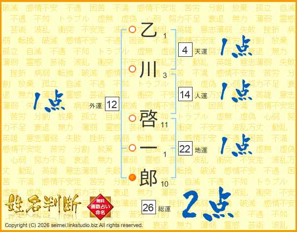 乙(1画)川(3画) 啓(11画)一(1画)郎(10画)