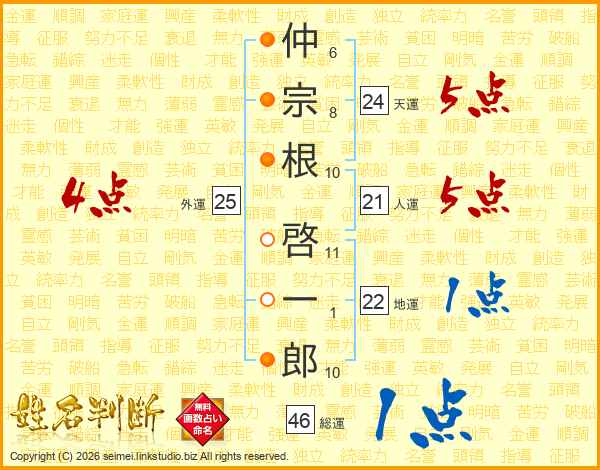 仲(6画)宗(8画)根(10画) 啓(11画)一(1画)郎(10画)