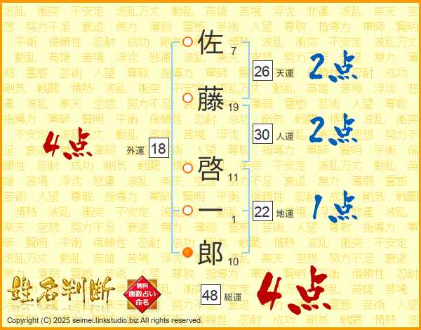 佐(7画)藤(19画) 啓(11画)一(1画)郎(10画)
