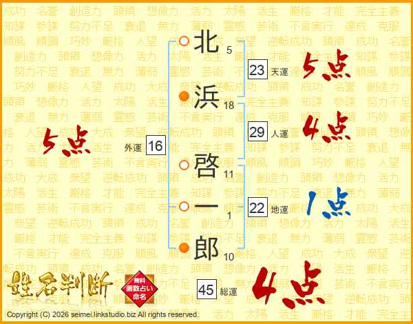 北(5画)浜(18画) 啓(11画)一(1画)郎(10画)