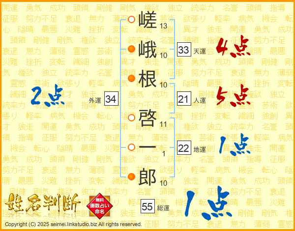 嵯(13画)峨(10画)根(10画) 啓(11画)一(1画)郎(10画)