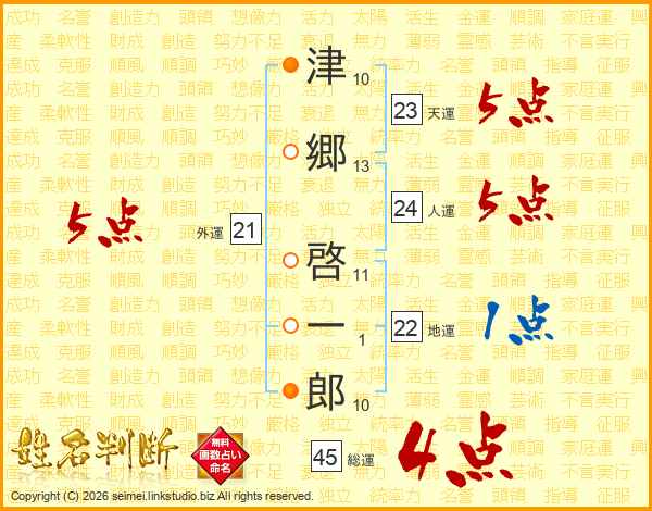 津(10画)郷(13画) 啓(11画)一(1画)郎(10画)