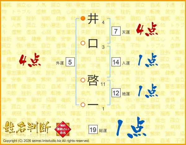 生活面を象徴する運勢です。外部から受ける影響力を表し、結婚運、家庭運や職場、環境への順応性を表します。総運から人運を引いた画数。姓や名が1文字の場合を除く。