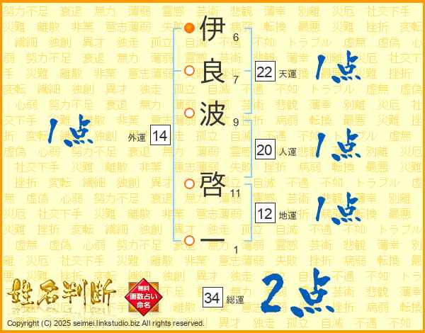 伊(6画)良(7画)波(9画) 啓(11画)一(1画)