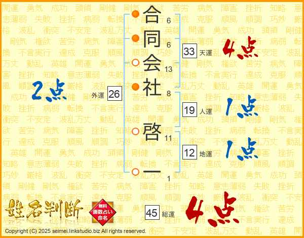 合(6画)同(6画)会(13画)社(8画) 啓(11画)一(1画)
