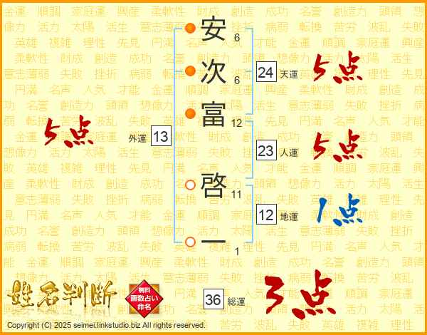 安(6画)次(6画)富(12画) 啓(11画)一(1画)