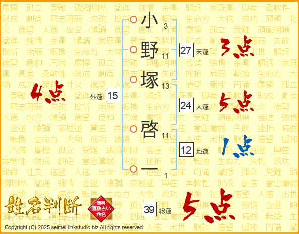 小(3画)野(11画)塚(13画) 啓(11画)一(1画)