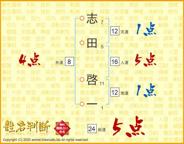 あなたの人生を表す1番重要な運勢です。生涯を通じて影響する総合運となり、主に50歳以降の晩年期に影響を及ぼします。苗字と名前の合計画数。