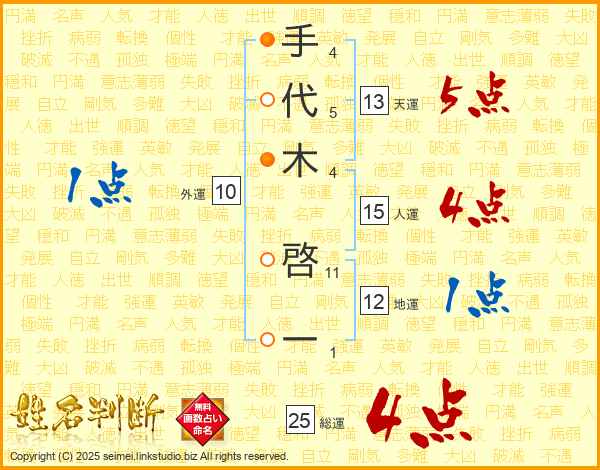 手(4画)代(5画)木(4画) 啓(11画)一(1画)
