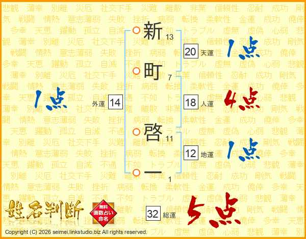 生活面を象徴する運勢です。外部から受ける影響力を表し、結婚運、家庭運や職場、環境への順応性を表します。総運から人運を引いた画数。姓や名が1文字の場合を除く。