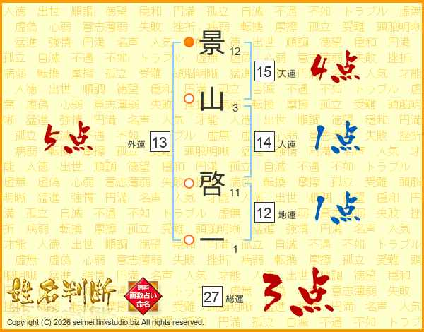 生活面を象徴する運勢です。外部から受ける影響力を表し、結婚運、家庭運や職場、環境への順応性を表します。総運から人運を引いた画数。姓や名が1文字の場合を除く。