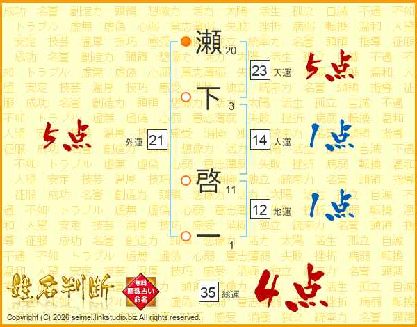 瀬(20画)下(3画) 啓(11画)一(1画)