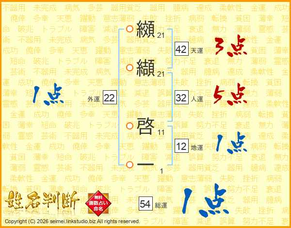生活面を象徴する運勢です。外部から受ける影響力を表し、結婚運、家庭運や職場、環境への順応性を表します。総運から人運を引いた画数。姓や名が1文字の場合を除く。