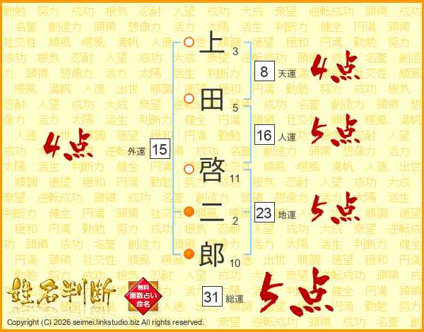 上(3画)田(5画) 啓(11画)二(2画)郎(10画)