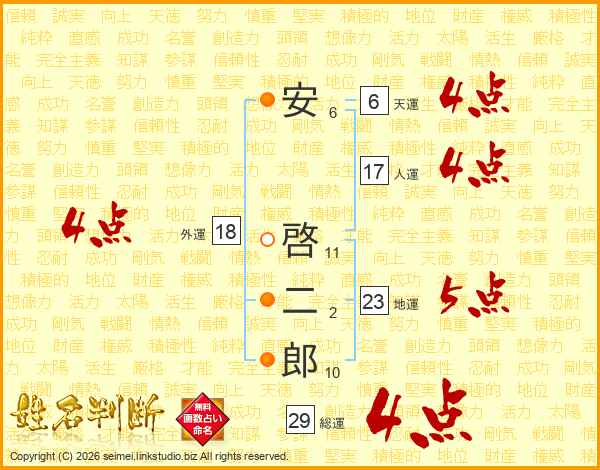 あなたの人生を表す1番重要な運勢です。生涯を通じて影響する総合運となり、主に50歳以降の晩年期に影響を及ぼします。苗字と名前の合計画数。