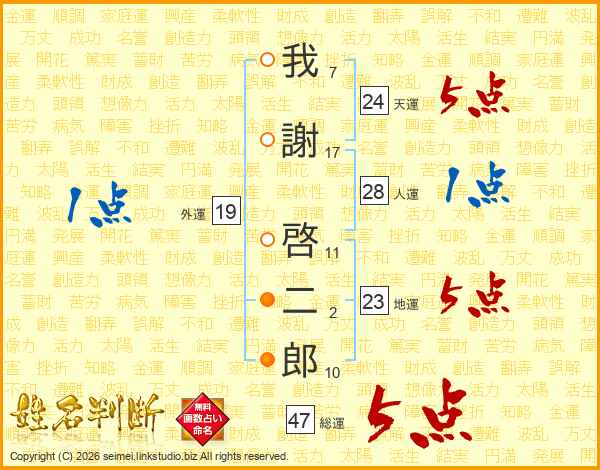 我(7画)謝(17画) 啓(11画)二(2画)郎(10画)