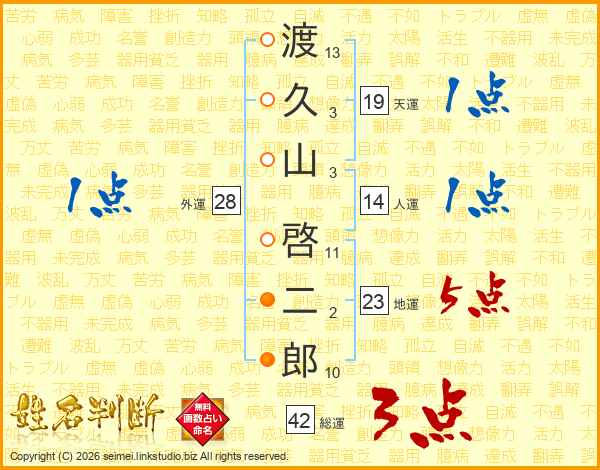 渡(13画)久(3画)山(3画) 啓(11画)二(2画)郎(10画)