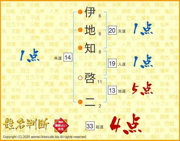 伊(6画)地(6画)知(8画) 啓(11画)二(2画)