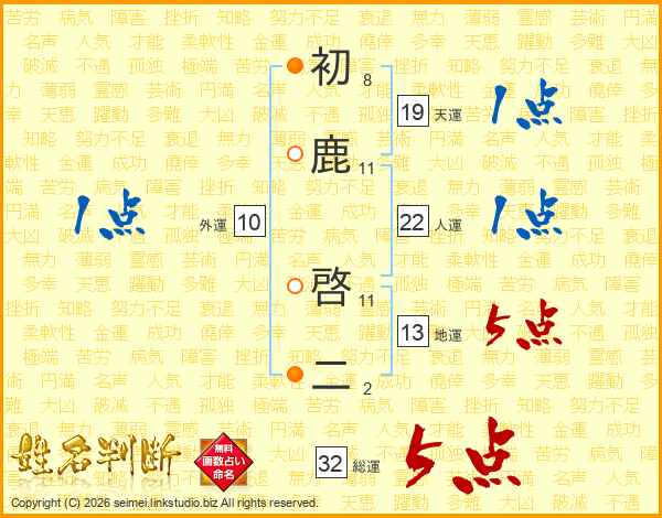 初(8画)鹿(11画) 啓(11画)二(2画)