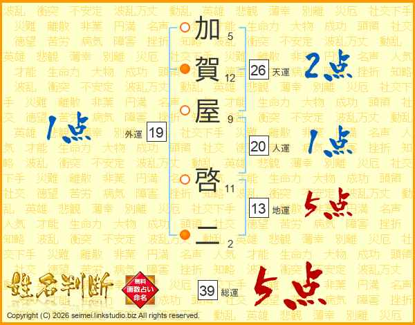 加(5画)賀(12画)屋(9画) 啓(11画)二(2画)