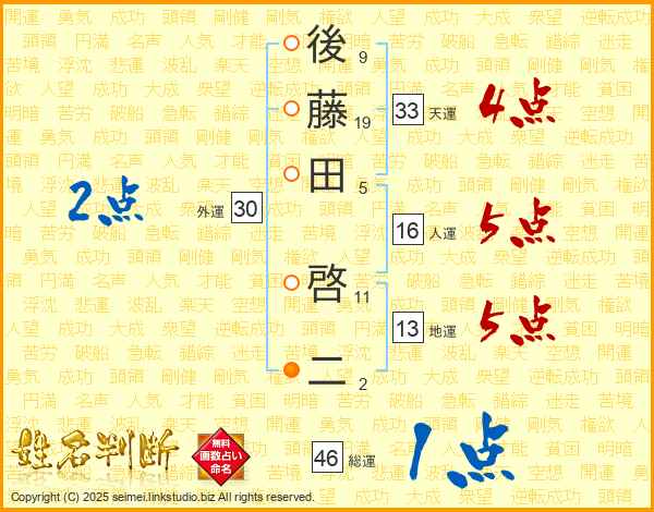 後(9画)藤(19画)田(5画) 啓(11画)二(2画)