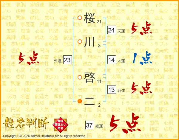 桜川啓二さんの総運は37画の5点!